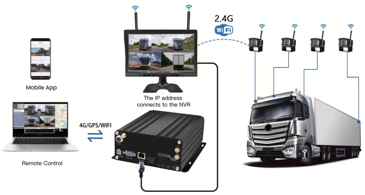 Kamera Tampilan Dalam Kabin Pemantauan Pengemudi AHDCarleader 10.1 Inch 4CH Wireless HDD Mobile NVR System, sistem NVR seluler canggih yang dirancang untuk manajemen armada. Sistem menggunakan 4 buah kamera IP nirkabel yang dipasangkan dengan monitor kabel 10,1 inci melalui sinyal 2,4GHz, kemudian menghubungkan montior dan NVR dengan konektor RJ45. tidak perlu masalah perkabelan tambahan, lebih efektif untuk instalasi dan manajemen armada.