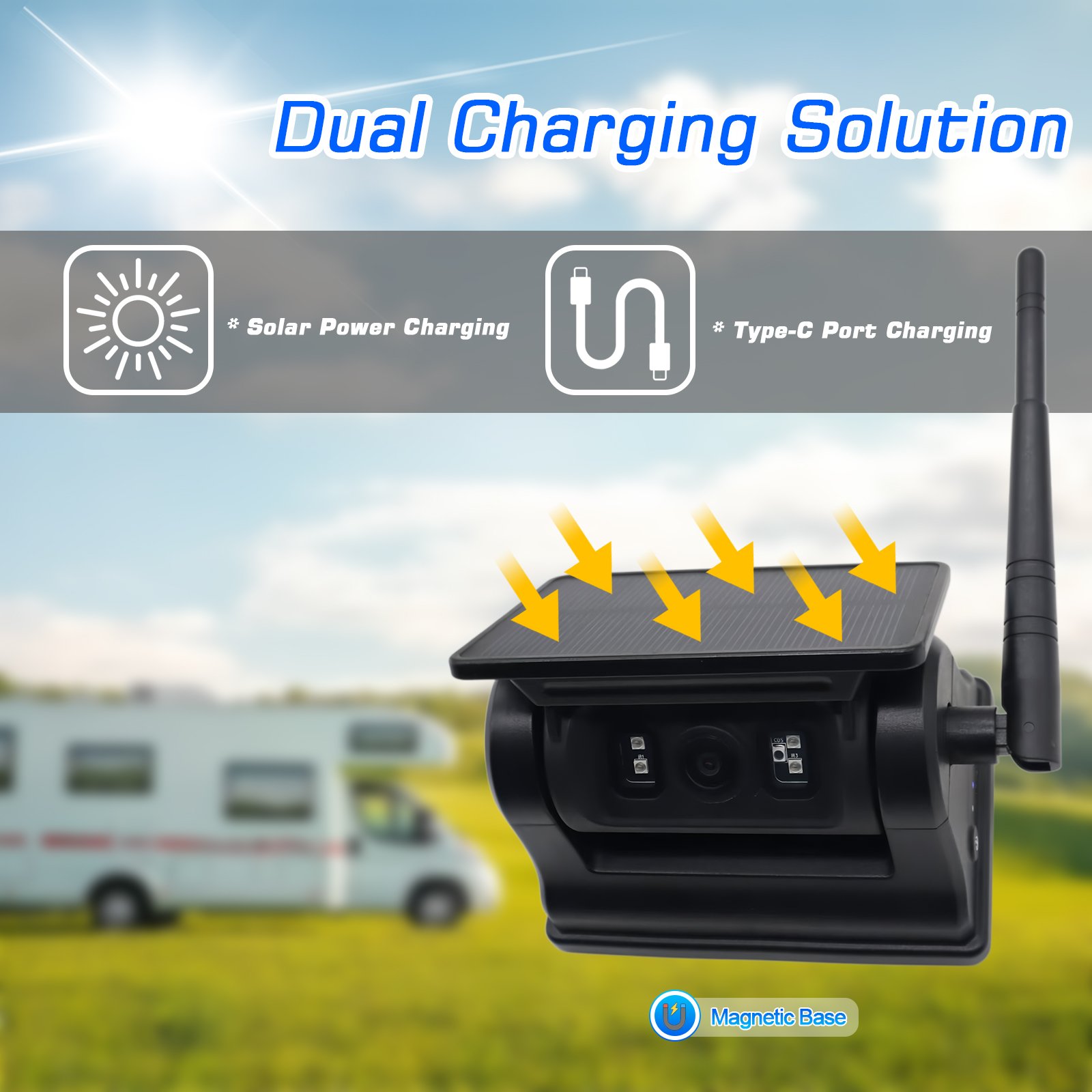 4. 2.4G WiFi Wireless Connection,1080p Magnetic Solar WiFi Wireless RV Backup Cameramengirimkan rekaman waktu nyata langsung ke perangkat iOS atau Android Anda melalui aplikasi khusus. Koneksi yang stabil dalam jarak jauh dan tidak ada penundaan sinyal