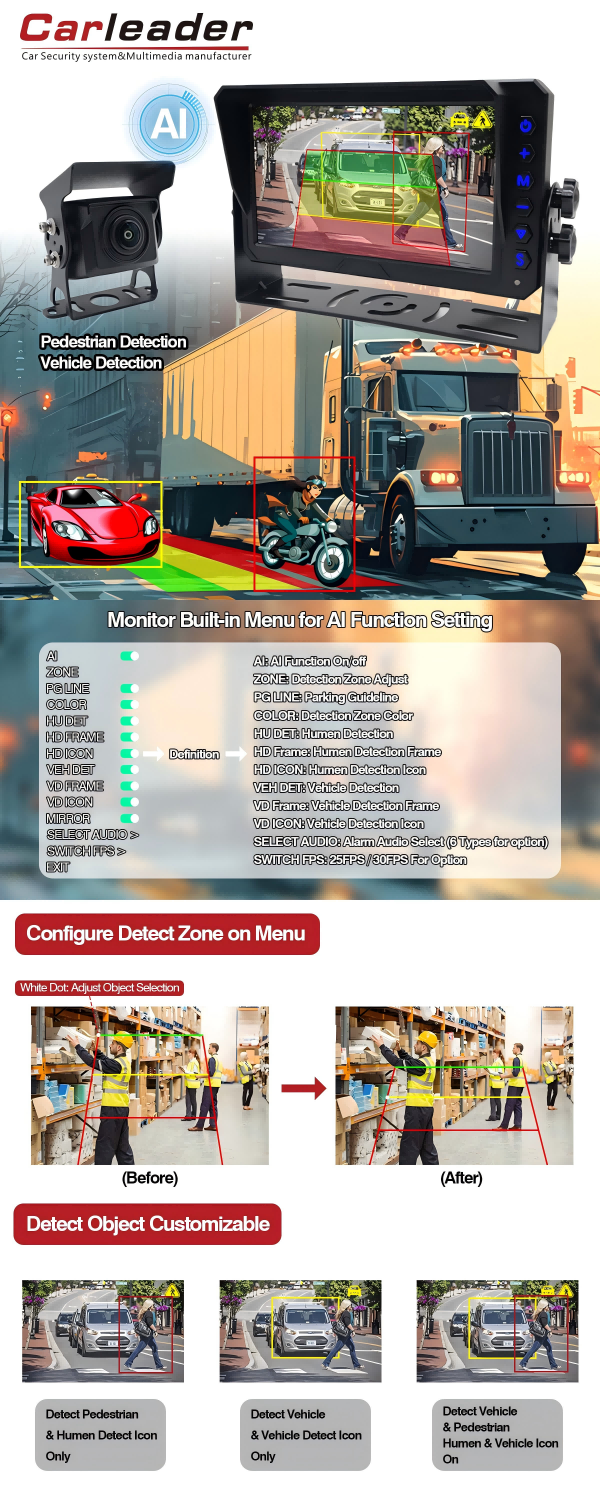 Kamera Tampilan Dalam Kabin Pemantauan Pengemudi AHDCarleader 7 Inci AI BSD Sistem Pemantauan Deteksi Titik Buta Mendukung Kalibrasi AI dirancang dengan algoritma AI presisi tinggi yang canggih dan pengoperasian cz menu yang mudah digunakan. Sistem kamera AI ini memberi pengemudi peringatan dinamis pejalan kaki dan kendaraan dalam segala cuaca dan berpresisi tinggi, sehingga secara efektif mengurangi risiko kecelakaan lalu lintas. Sistem kamera pemantauan AI cocok untuk mobil pribadi, armada komersial, dan kendaraan khusus. Sistem AI armada memiliki integrasi dan kompatibilitas yang kuat, daya tahan, dan kemampuan pemantauan waktu nyata.