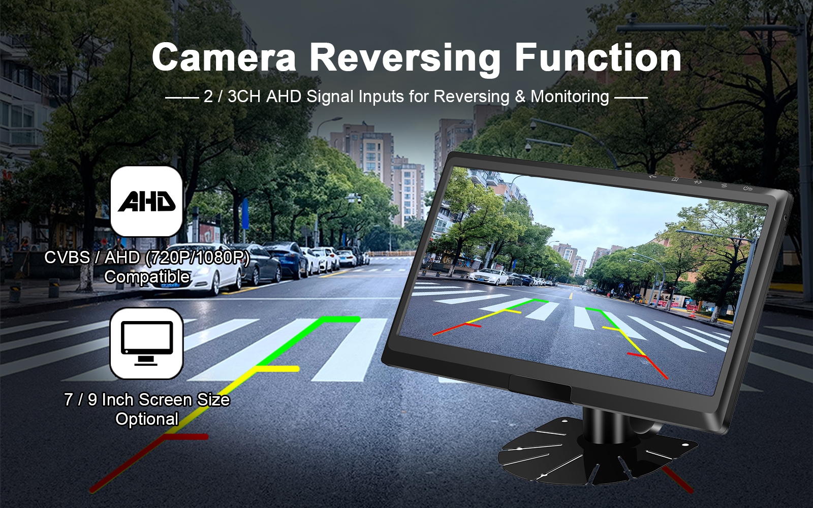 Kompatibilitas Multi-Kamera – Bekerja dengan kamera AHD (720P / 1080P) dan CVBS, mendukung input video hingga 1080P pada 25/30fps (PAL/NTSC).