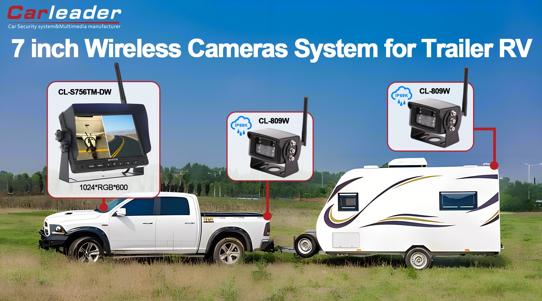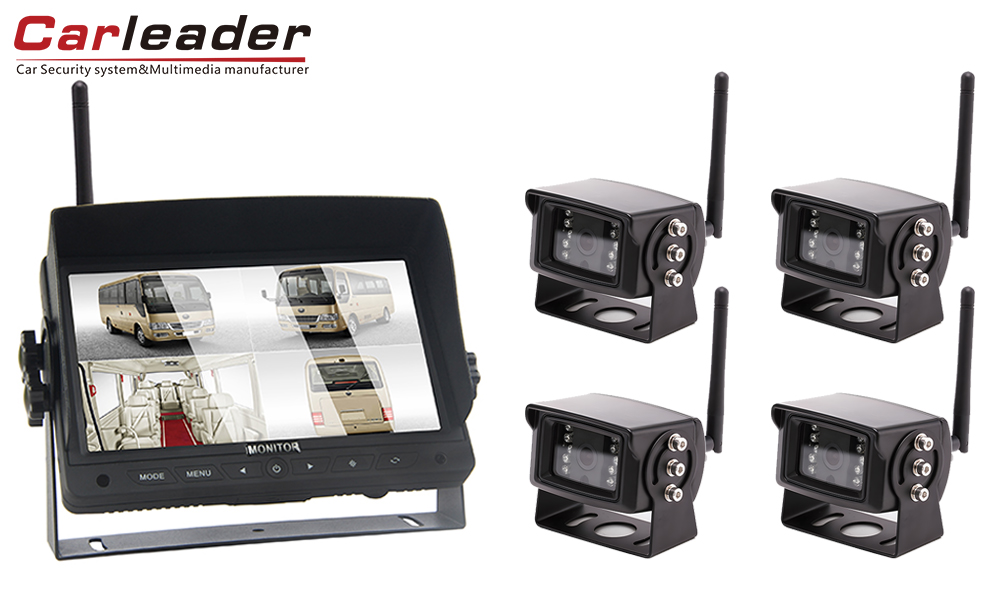 Pemimpin mobilSistem kamera tampilan terpisah 2CH nirkabel Digital 7 inci 2.4G, sistem pemantauan nirkabel berkinerja tinggi dengan dukungan 2 tampilan layar slipt, dipadukan dengan 2 buah kamera nirkabel. Panel digital 7 inci, rasio gambar 16 : 9, resolusi 1024 x 600 (RGB), memberikan kejernihan tinggi bagi pengemudi dalam pengalaman berkendara.