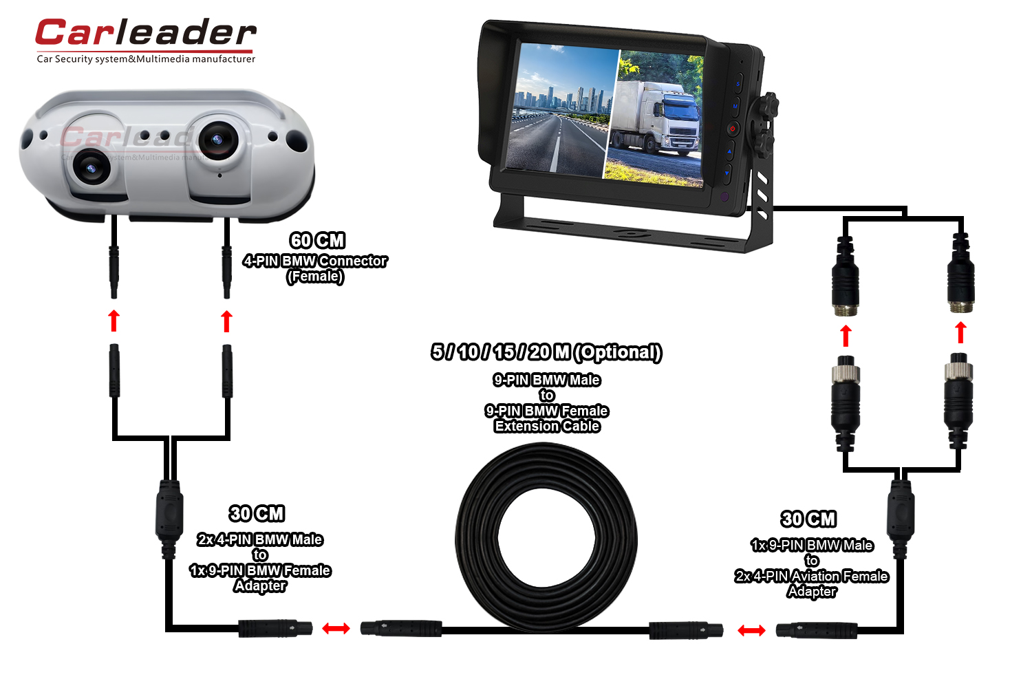 Solusi pertama hanya menggunakan satu kabel ekstensi (konektor BMW 9-PIN), 1 hingga 2 kabel terpisah di kedua ujungnya untuk menghubungkan kamera dan monitor. Karena solusi ini hanya kami pada kabel ekstensi, yang membuat proses pengkabelan lebih mudah dan nyaman.