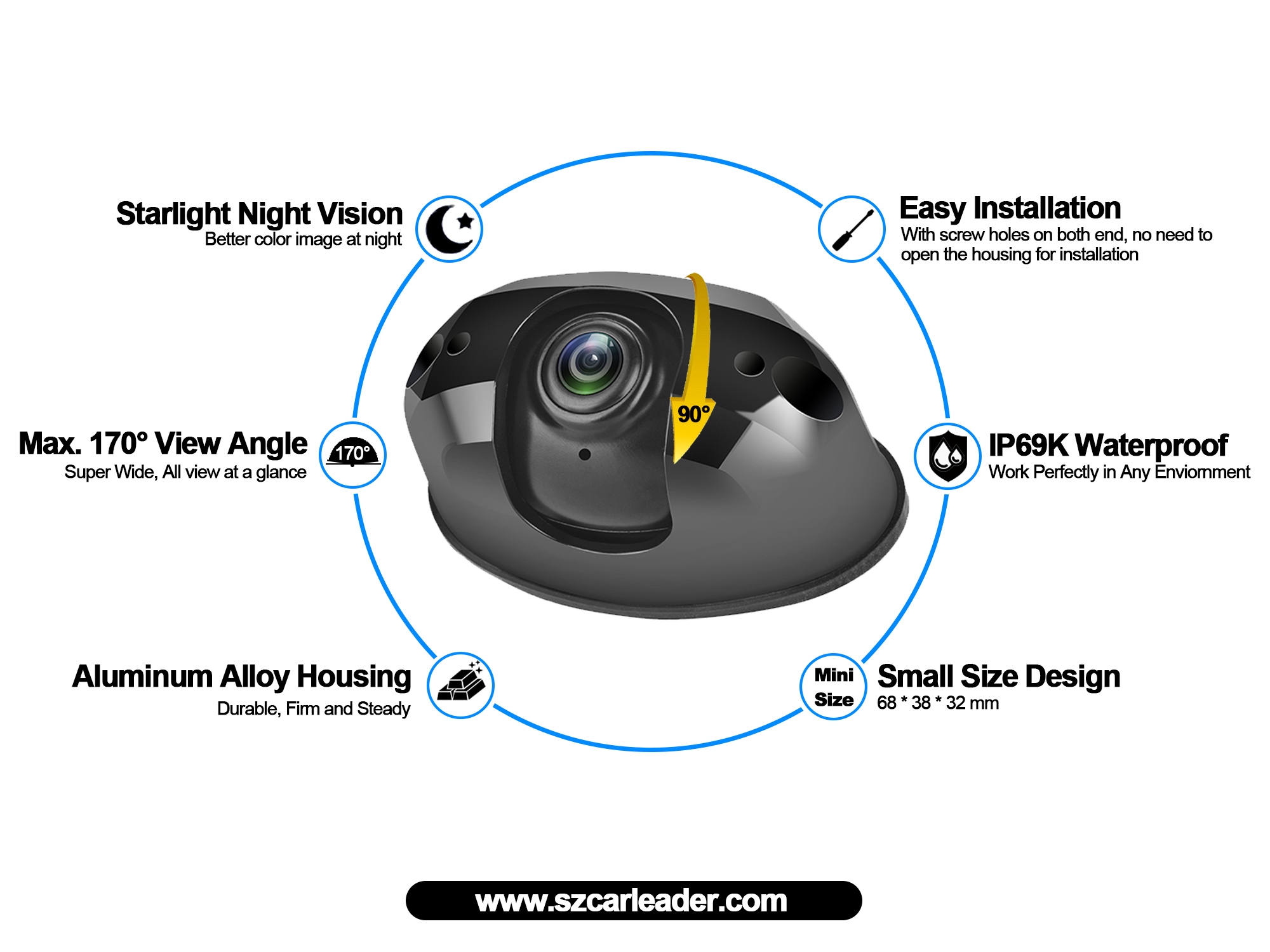 Kamera Cadangan Tugas Berat Tahan Air Sudut Pandang Lebar 170 Derajat AHD memberi pengemudi gambaran real-time yang jelas selama proses berkendara. Sudutnya yang super besar hingga 170°, lebih bagi pengemudi untuk memberikan jangkauan pemantauan yang luas, sehingga pengemudi dapat memantau lingkungan sekitar kendaraan tanpa adanya titik buta.