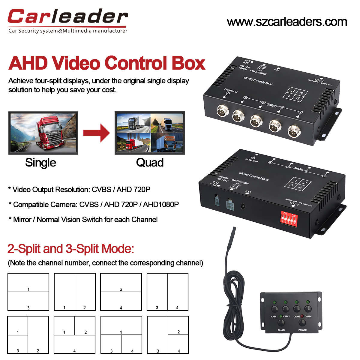 Inti dari kotak split video quad AHD ini adalah catu daya dan multiplexer video, digabungkan menjadi satu perangkat untuk kendaraan. Seperti bus, truk, trailer dan kendaraan tugas berat lainnya. 4 saluran dirancang untuk mendukung hingga empat kamera AHD independen. Dan bekerja dengan satu monitor. Tampilan quad adalah fungsi utama kotak kontrol AHD 4 saluran. kotak kontrol terpisah AHD kendaraan menerima sinyal video dari keempat kamera mobil yang terhubung dan menampilkan keempat gambar secara bersamaan pada satu monitor layar. Kotak kontrol mengacu pada fungsi kotak lainnya, kotak kontrol terpisah AHD memberikan daya ke kamera dan mengontrol tampilan tunggal atau tampilan layar terpisah. AHD (Analog High Definition) menentukan format video yang kompatibel dengan tampilan dan kotak kontrol. Kotak kontrol video AHD cocok untuk kamera AHD (misalnya AHD 720p, 1080p) atau kamera CVBS. Hanya empat kamera AHD atau empat kamera CVBS yang didukung secara bersamaan.