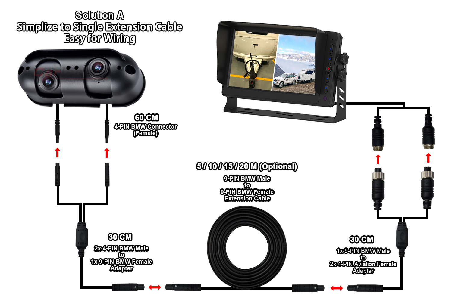 Solusi pertama hanya menggunakan satu kabel ekstensi (konektor BMW 9-PIN), 1 hingga 2 kabel terpisah di kedua ujungnya untuk menghubungkan kamera dan monitor. Karena solusi ini hanya kami pada kabel ekstensi, yang membuat proses pengkabelan lebih mudah dan nyaman.
