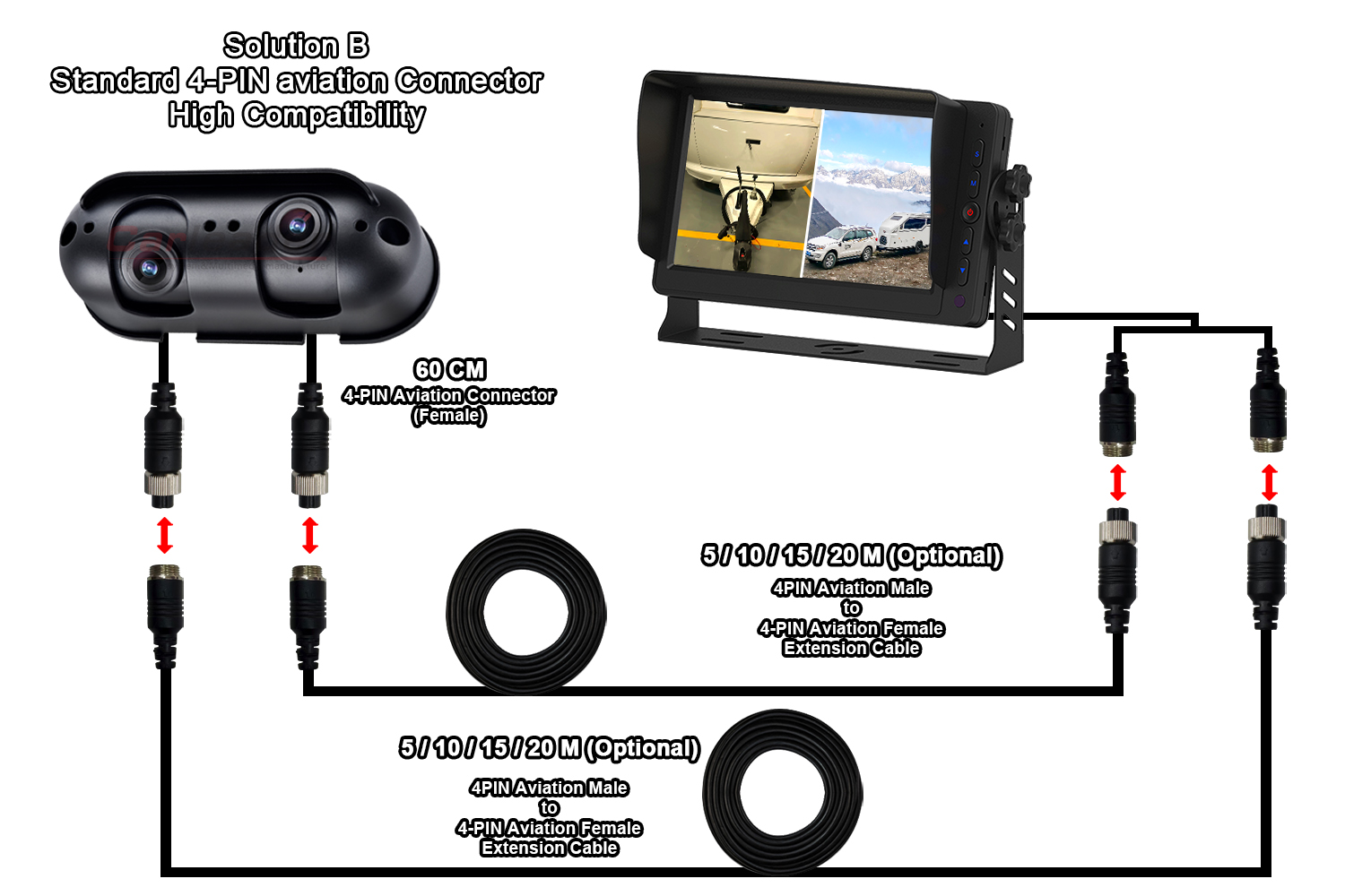 Pemimpin mobilakan menawarkan dua solusi pengkabelan berbeda untuk Kamera Tampak Belakang Lensa Ganda AHD Starlight yang cocok untuk RV Motorhome, agar sesuai dengan kebutuhan pengkabelan yang berbeda: