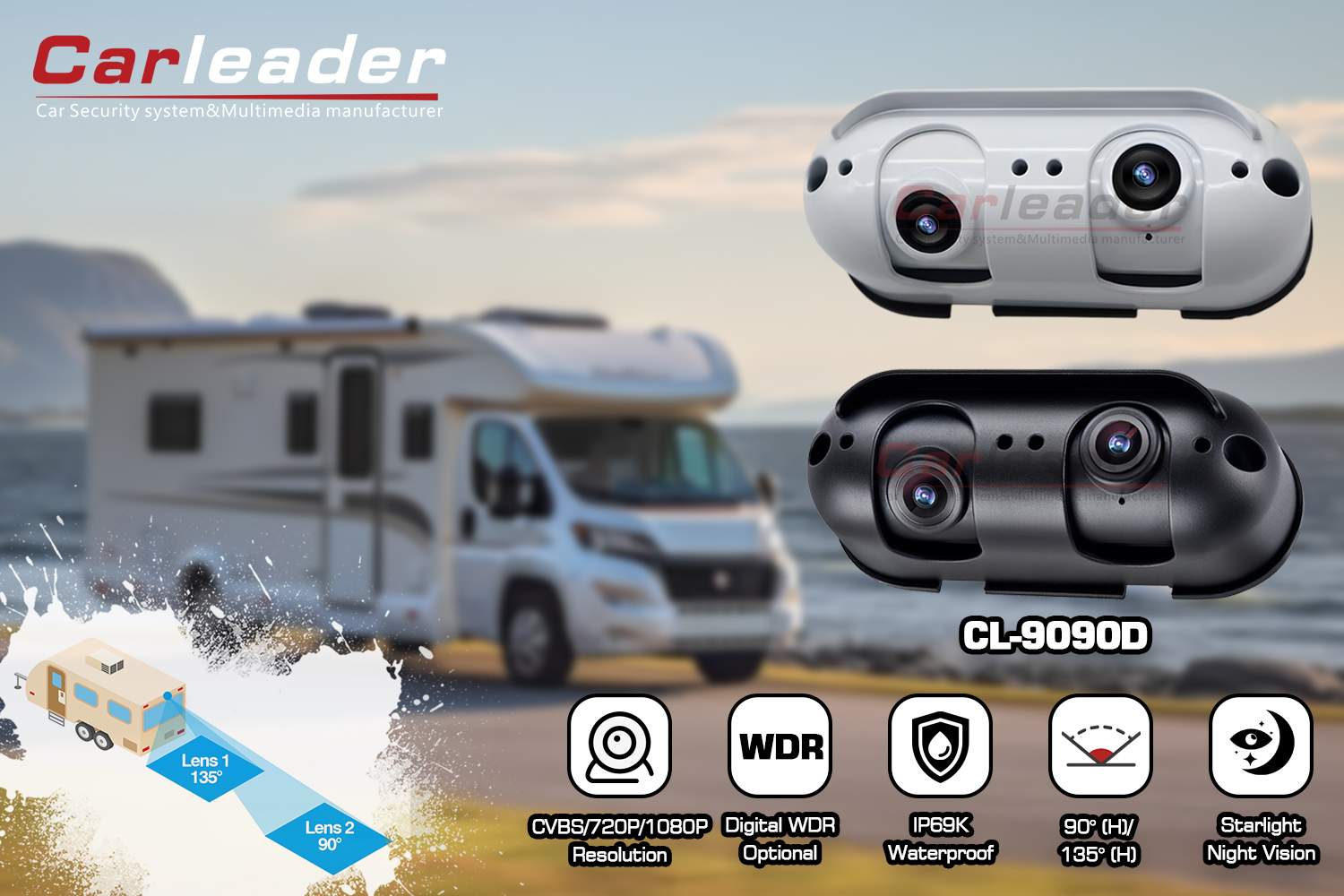 Pemimpin mobilKamera tampilan belakang lensa ganda AHD Starlight cocok untuk RV Motorhome, kamera tampak belakang AHD perkakas pribadi dari Carleader, desain lensa ganda memungkinkan pengguna memiliki kinerja visibilitas yang jelas pada pandangan belakang jarak dekat dan jauh. Housing berbahan paduan aluminium dan rating IP69K membuat kamera lebih kokoh dan tahan lama dalam kondisi cuaca buruk apa pun. Kamera ini tidak hanya cocok untuk kendaraan tugas berat, seperti truk, bus, forklift, dll; juga cocok untuk kendaraan motorhome, seperti RV dan karavan.