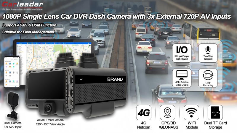 Kamera Dasbor ADAS+DSM Bertenaga AI Carleader 4CH Mendukung Output Video ideal Untuk: Armada komersial, kendaraan logistik, transportasi umum, dan kendaraan pribadi yang mencari peningkatan keselamatan, pemantauan waktu nyata, dan perekaman insiden yang andal.